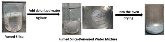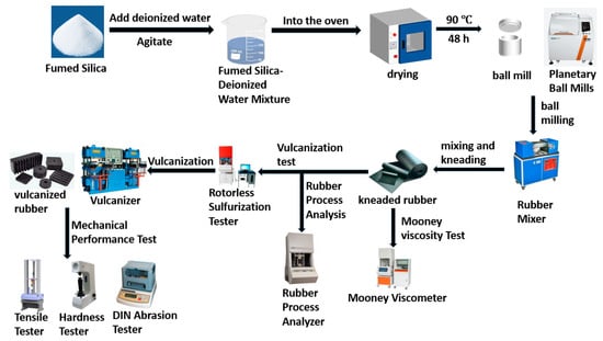By incorporating hydrated and surface-modified fumed silica, this study provides a practical solution to the challenges of industrial rubber production, ensuring enhanced performance and environmental safety. The pretreatment process of fumed silica is shown in Figure 1