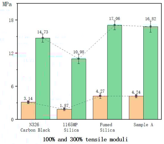 The surface of fumed silica contains numerous silanol (Si–OH) groups, which can chemically bond with rubber molecules to form strong interfacial interactions. To enhance compatibility with hydrophobic rubber matrices, silane coupling agents such as sulfur-containing silane (TESPT) are often used. These agents possess dual functional groups: one reacts with silica’s hydroxyl groups to form covalent bonds, while the other reacts with the unsaturated double bonds in rubber during vulcanization, creating a robust chemical network [27,28,29,30,31].
