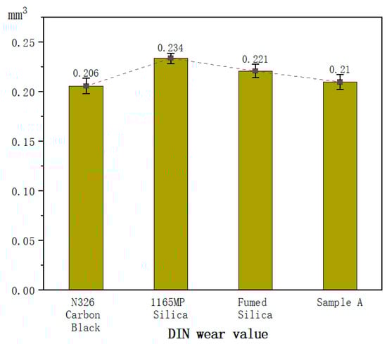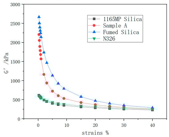 The specific surface area of fumed silica ranges from 200 to 500 m2/g, with particle sizes typically between 10 and 40 nm. Smaller particle sizes lead to larger specific surface areas, increasing contact with rubber matrices and providing enhanced reinforcement [4]. When dispersed in rubber, fumed silica boosts the material’s elastic modulus, improving resistance to deformation. The rigid nanoparticles dissipate stresses during deformation through inter-particle friction, reducing direct matrix damage. Furthermore, the nanoparticles endure a portion of the frictional forces during wear, improving the abrasion resistance and longevity of rubber products [5,6,7].