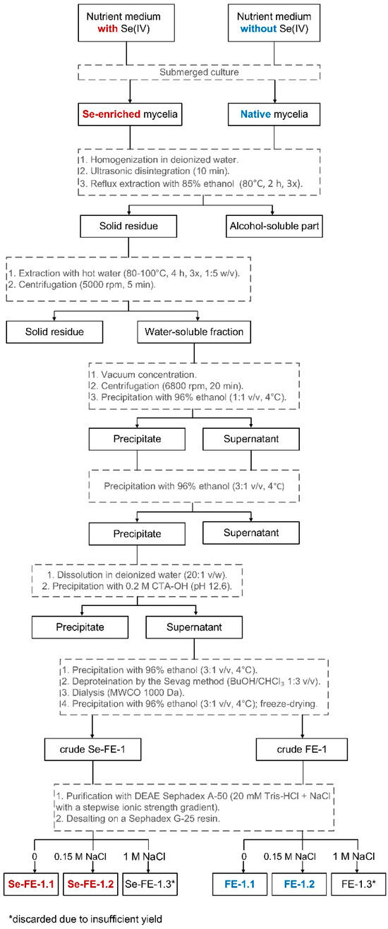 The Se-enriched biomass obtained from several bioreactors was soaked in deionised water, blended (T 25 digital ULTRA-TURRAX, IKA, Warsaw, Poland), and initially disintegrated in an IS-2 ultrasonic cleaning device (InterSonic, Olsztyn, Poland) for 10 min. The mycelium was then extracted three times with 85% ethanol (80 °C, 6 h) to remove substances of low-to-medium polarity (e.g., lipids and cell membrane components). After discarding the ethanol extracts, the defatted biomass was suspended in deionised water at a weight ratio of 30:1 and subjected to three rounds of hot water extraction with continuous stirring over 12 h. Once cooled, the resulting suspension was centrifuged at 5000 rpm for 5 min (High-Speed Brushless Centrifuge MPW-350, Warsaw, Poland). The separated aqueous extract was concentrated under reduced pressure until slight turbidity appeared, reaching approximately 20% of the original volume. It was then combined with 96% ethanol in a 1:1 volume ratio and allowed to stand overnight at 4 °C. The precipitate was removed by centrifugation (6800 rpm, 20 min), and three volumes of ethanol were added to the supernatant, which was stored overnight at 4 °C. The brown sediment of the initial Se-FE fraction (corresponding to Chihara’s fraction E) was collected by centrifugation, followed by lyophilisation; it was then dissolved in water (20:1 v/w) and centrifuged again to remove insoluble impurities [17]. Small portions of aqueous CTA-OH were then added until no further sediment formed (pH 12.6). After discarding the sediment, three volumes of ethanol were added to the supernatant, and the mixture was left overnight at 4 °C. Following centrifugation and vacuum drying over P2O5, the brown sediment was redissolved in deionised water and deproteinated using Sevag reagent (butyl alcohol/chloroform, 1:3 v/v) [18]. After extensive dialysis using a Spectra/Por® 7 dialysis membrane (MWCO 1000 Da, 45 mm; Carl Roth, Karlsruhe, Germany), the crude Se-FE-1 fraction was obtained by adding three volumes of ethanol, followed by lyophilisation. The reference crude polysaccharide fraction, FE-1, was extracted from L. edodes mycelium cultivated in a medium not enriched with Se, using the same method.