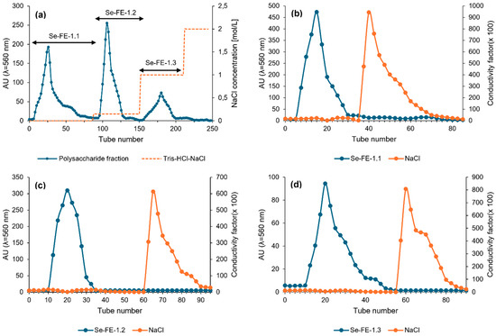 (a) Stepwise ion-exchange chromatography profile of the crude Se-FE-1 polysaccharide fraction on DEAE-Sephadex A-50 resin. The three distinct peaks correspond to polysaccharide fractions Se-FE-1.1, Se-FE-1.2, and Se-FE-1.3 eluted with Tris-HCl buffer at increasing ionic strength (0–1 M NaCl). (b–d) Elution profiles of Se-FE-1.1, Se-FE-1.2, and Se-FE-1.3 during purification on a Sephadex G-25 desalting column.