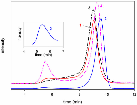 HPGPC chromatograms of the FE and Se-FE fractions. Solid lines represent (1) FE-1.1 and (2) FE-1.2. Dashed lines represent (3) Se-FE-1.1 and (4) Se-FE-1.2. The inset figure shows a fragment of the FE-1.2 chromatogram with increased intensity.
