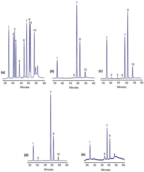 HPLC analysis of the monosaccharide composition of Se-enriched polysaccharides and their non-Se-enriched reference fractions: (a) standard sample, (b) FE-1.1, (c) FE-1.2, (d) Se-FE-1.1, and (e) Se-FE-1.2. Peaks: (1) mannose, (2) glucosamine, (3) ribose, (4) rhamnose, (5) glucuronic acid, (6) galactosamine, (7) glucose, (8) galactose, (9) xylose, and (10) fucose.