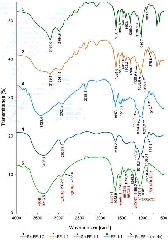 Bands around 1631–1653 cm−1 were assigned to amide I vibrations caused by the presence of N-linked carbonyl groups (C=O) and the in-plane bending of bound water. These bands were common but varied slightly in intensity and shape among the spectra. Additionally, bands near 1540 cm−1 in the crude Se-FE-1 fraction, as well as at 1517.9 cm−1, 1553.6 cm−1, and 1559.3 cm−1 in the Se-FE-1.1, Se-FE-1.2, and FE-1.2 fractions, respectively, were characteristic of amide II N–H deformation. These results may indicate the presence of chitin residue, a minor component of the mushroom cell wall, or amino sugars (such as N-acetylglucosamine and galactosamine). Additionally, these bands could suggest protein contamination or the presence of proteins due to the formation of polysaccharide–protein conjugates [27,28,29].