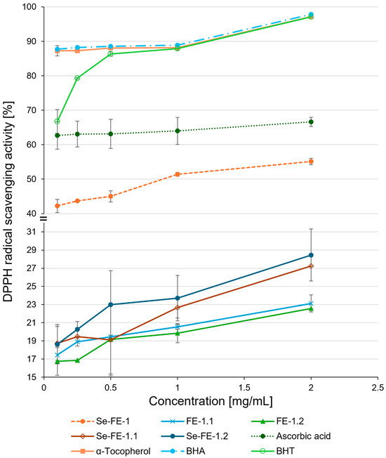 DPPH radical scavenging ability of purified Se-enriched polysaccharides, Se-FE-1.1 and Se-FE-1.2, compared with their unmodified non-Se-enriched analogues, FE-1.1 and FE-1.2; the crude Se-FE-1 fraction; and reference antioxidants. Each value represents the mean ± standard deviation (n = 3).