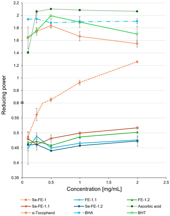 Reducing power of purified Se-enriched polysaccharide fractions, Se-FE-1.1 and Se-FE-1.2, compared with their unmodified non-Se-enriched analogues, FE-1.1 and FE-1.2; the crude Se-FE-1 fraction; and reference antioxidants. Each value represents the mean ± standard deviation (n = 3).