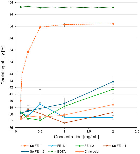 The study also showed similar results regarding ferrous ion chelating ability (Figure 9). At the highest concentration, the crude Se-FE-1 fraction exhibited approximately twice the Fe2+ binding capacity compared with the purified polysaccharides. Initially, the chelation ability of the crude Se-FE-1 fraction increased with concentration, but at 0.5 mg/mL, it reached a stable level (approximately 85%), about 15% lower than that of EDTA, which was used as a reference. The chelating ability of the purified polysaccharide fractions remained constant at approximately 40%, comparable to that of citric acid, with peak activity observed at the lowest concentration tested (0.1 mg/mL). The results did not reveal significant differences between the Se-enriched and non-Se-enriched polysaccharides across the tested concentration range. Although the chelating abilities of all purified polysaccharides appeared similar, statistically significant differences (p ≤ 0.05) indicated slightly higher activity in the FE-1.2 and Se-FE-1.2 fractions than in both the Se-FE-1.1 polysaccharide and its unmodified FE-1.1 counterpart.