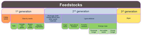 Biomass to produce polymers to be used as structuring agents and fillers is mainly derived from animal, vegetable, and microbial wastes and by-products. Depending on their specific source, they are classified into first-, second-, and third-generation feedstock (Figure 1). The first-generation feedstocks are agricultural products, such as vegetable oils, corn, grain, and sugar. Although first-generation feedstocks are renewable, they compete with the food economy chain, encouraging deforestation and biodiversity loss. Second-generation feedstock can be partly addressed by producing monomers from non-food crops, industrial and urban waste, and agricultural and forest waste. This approach is expected to have significant positive consequences on reducing intensive cultivation and, thus, on costs. However, producing compounds from second-generation biomasses is still challenging due to biomass complexity requiring multiple pretreatment processes.