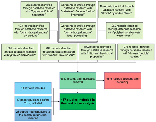 Inclusion criteria included (a) articles published in peer-reviewed journals between 2019 and 2023; (b) studies focused on biopolymers derived from agri-food waste and by-products; (c) investigations analyzing chemical–physical properties, structural characteristics, and applications in food packaging; and (d) research evaluating biopolymers as structuring agents or fillers for films and coatings. Exclusion criteria included (a) studies on biopolymers derived from non-food waste/by-products; (b) research lacking biopolymer characterization or not applicable to food packaging; (c) articles such as conference proceedings, book chapters, and patents; and (d) studies published in languages other than English.