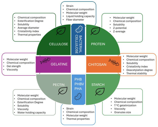 Natural biopolymers derived from plant sources or industrial waste and by-products show film-forming properties that exhibit various functional properties intricately linked to their molecular characteristics (molar mass, hydrophobicity, electrical charge). Understanding these relationships allows for the tailored use of biopolymers in various industrial applications, including food packaging. Table 1 describes the properties of plant-based biopolymers extracted from different agri-food waste and by-products. In detail, the molecular weight, chemical composition, solubility, and some physical properties that affect their applications in food packaging are reported, as depicted in Figure 4.