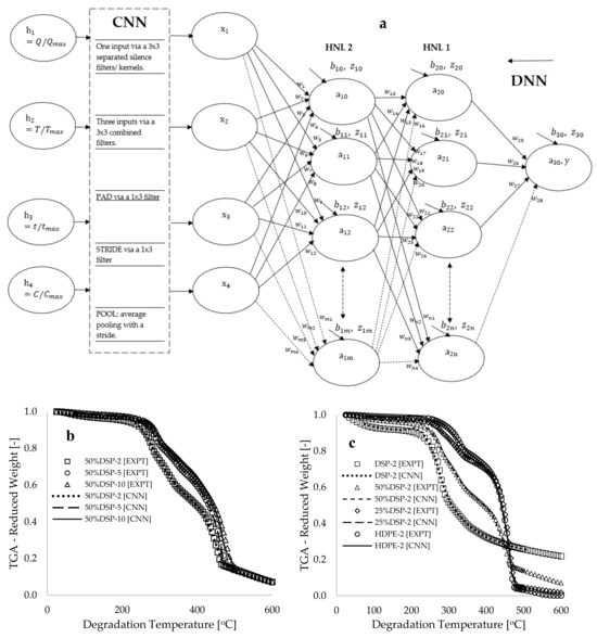 Figure 2a presents a convolutional deep neural network (CDNN) framework that illustrates the connection between input data and the convolutional neural network (CNN) segment of the framework, the output from the CNN to the deep neural network (DNN) component, the hidden neurons within the DNN framework, and the output neuron. The CNN segment depicted in Figure 2a demonstrates the transmission of selected features and labels through a series of kernels (filters), which function as data extractors to produce a convolutional output referred to as a vector [41]. The filter is commonly employed in convolutional operations to detect silence at any position within the data, and its operations can be conceptualized as a small multilayer perceptron (MLP) that traverses the input signal [42], thereby inducing a temporal shift in the output signal. In Figure 2a, the selected input data are processed through three 3 × 3 separated filters containing values of −1 and +1, resulting in the generation of three distinct vectors. These multiple vectors are subsequently subjected to another combined 3 × 3 filter, yielding a single vector. To preserve the classification of dimensionality, a one-dimensional padding was applied to both boundaries, followed by the passage of the vector through a 1 × 3 filter. A two-step convolutional stride and an average pooling operation were performed on the vector to produce the final reduced classification. The output data obtained from the convolution operator are represented as a single-column vector with values ranging between 0 and 1.0. A total of 420 data points per variable were extracted from the 996 selected data points following the convolutional operation. Figure 2b,c illustrate plots of selected experimental data (EXPT) and the CNN-processed data against the degradation temperature. These figures display complete overlaps between the CNN-modeled and selected experimental data (R2~0.999), indicating that the convolutional kernels have been effectively learned. Therefore, it is essential to recognize that this convolutional approach may be characterized as a data selection technique—extracting significant features and labels for modeling while reserving the unselected data for cross-validation (to be discussed further).