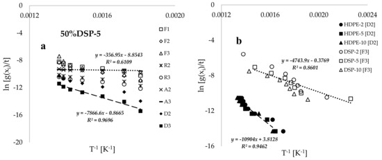 Figure 5a presents plots of Borchardt and Daniels’ ln(g()/t) versus the inverse of conversion temperature (T−1, [K−1]) for the 50%DSP-5 sample, corresponding to the selected solid-state reaction mechanisms. The estimated values of kinetic and thermodynamic data by using the BD method are provided in Table 3. Both Table 3 and Figure 4a indicate that higher values of the coefficient of determination (R2) were achieved by using the D2 and D3 diffusion models, while poorer fits were obtained by using the A2 and A3 Avarami–Erofeev models. Figure 5b displays the plots of BD’s ln(g()/t) against the inverse of conversion temperature (T−1, [K−1]) for the pure HDPE and DSP samples at various heating rates. This figure demonstrates that the trends associated with pure HDPE shifted towards the temperature maxima when compared with the linear inverse trends associated with pure DSP biomass, indicating a higher thermal stability of the HDPE plastic material. This finding is consistent with the study conducted in [9] on the thermal degradation of polyethylene plastic and walnut biomass. Additionally, Figure 5b illustrates that increasing the heating rate consistently results in a shift in the inverse linear trends towards the temperature maxima. However, these trends do not vary significantly due to the proximity of the selected heating-rate values when compared to the thermal degradation processes recorded for high heating rates in [6,11,15].