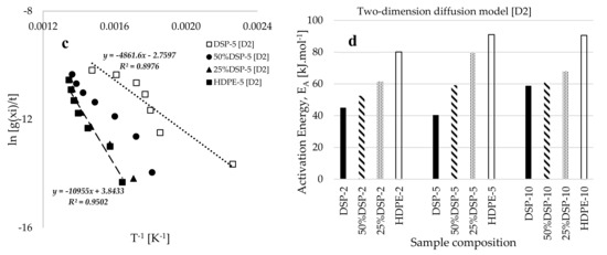 Plots of Borchardt and Daniels’ of selected solid-state reaction mechanisms against the inverse of conversion temperature (T−1 [K−1]) for the (a) 50% DS-5 sample, (b) HDPE and DSP at different heating rates, and (c) samples of varied compositions and a constant heating rate of 5 °C.min−1 and (d) plots of estimated values of activation energy based on the two-dimension model [D2] against sample composition.