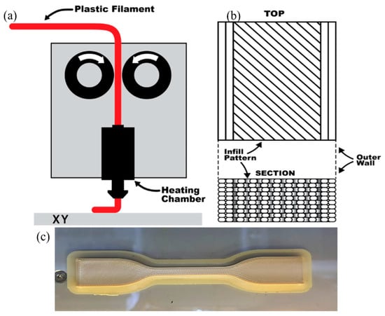 (a) The diagram of a standard extrusion process for Fused Deposition Modeling (FDM) 3D printing. The plastic filament is fed through a motor into a heated chamber then through the nozzle and onto the build platform. (b) This diagram represents the extrusion pattern showing 2 walls and solid infill at a 45° raster angle. (c) ASTM D638 3D-printed PEEK tensile sample with 5 mm brim.