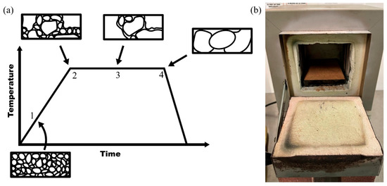 (a) Diagram of the progression of grain size and structure during annealing. (b) Thermolyne 1400 Furnace system used to anneal samples.