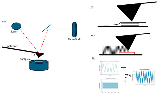 (a) Overview of the Atomic Force Microscopy (AFM) technique [43]. (b) Representation of contact mode on the AFM [44]. (c) Representation of tapping mode on the AFM [44]. (d) Representation of bimodal mode on the AFM [45].
