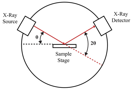 As seen in Figure 6, a powder X-ray diffractometer consists of an X-ray source, a sample stage, and a detector. The X-ray is focused on the sample at some angle θ, while the detector opposite the source reads the intensity of the X-ray it receives at 2θ away from the source path. The incident angle is then increased over time while the detector angle always remains 2θ above the source path. The diffractometer records the intensity versus 2θ angle as the X-ray beam scans across the angular range and a detector collects the scattered X-rays and converts them into an electronic signal [47].