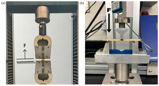 (a) Tinius Olsen testing apparatus used for ASTM D638 testing where the sample is pulled vertically, and the force is measured. (b) ADMET testing apparatus used for ASTM D790 testing where the force is applied and measured at the midpoint.