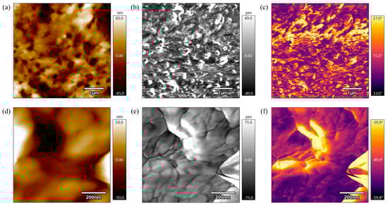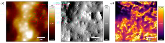 AFM analysis also derives the root mean square (RMS), which is a statistical measure used to quantify the variations in surface height across a given area [46]. RMS roughness provides a single value that represents the overall roughness of a surface in nanometers and is calculated by Equation (1) for a surface with height values zi at N points where is the mean surface height.