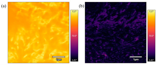 Figure 16 compares phase scans of samples annealed at 360 °C for different durations. Figure 16a, which was annealed for 3 h, shows a bright phase scan, while Figure 16b, annealed for 6 h, is a darker phase scan. These scans are similar to the previous scans of samples annealed at 330 °C for varying durations where the longer duration at the sample temperature results in a stiffer surface. The results indicate that extended annealing times allow for increased polymer chain rearrangement and alignment, leading to a more rigid material.