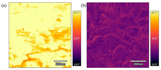 Figure 15 compares phase scans of samples annealed at 330 °C for different durations. Figure 15a, which was annealed for 3 h, shows a bright phase image, while Figure 15b, annealed for 6 h, is a darker phase image. The difference in phase contrast suggests that the sample annealed for a longer duration has undergone more molecular rearrangement, resulting in a more rigid material. This indicates that longer annealing times promote greater crystallinity and stiffness in the material.