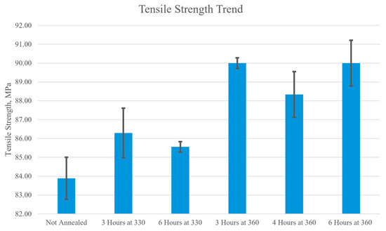 The macroscale mechanical properties of PEEK were evaluated through tensile and three-point bending tests to assess its performance under different loading conditions. In tensile tests, the load condition is uniaxial tension, where pulling forces are applied along the axis of the specimen, causing it to stretch and elongate. The results of the tensile tests, presented in Figure 19, demonstrate a clear trend that annealing PEEK at higher temperatures and for longer durations increases its tensile strength. The tensile strength of the non-annealed sample was measured at 83.9 ± 2.22 MPa, while the sample annealed at 360 °C for 6 h exhibited a significantly higher tensile strength of 90.0 ± 2.42 MPa. This represents an increase of 6 MPa, highlighting the impact of prolonged annealing at elevated temperatures on improving the mechanical properties of PEEK. There was also an improvement when the annealing temperature increased from 330 °C to 360 °C. The samples annealed for 3 h at 330 °C were 86.3 ± 2.63 MPa and the samples annealed for 3 h at 360 °C were 90 ± 0.56 MPa. The samples annealed for 6 h at 330 °C were 85.6 ± 0.56 MPa and the samples annealed for 6 h at 360 °C were 90 ± 2.42 MPa. Therefore, the samples annealed for 3 h had a 3.7 MPa increase with the increase in temperature and the samples annealed for 6 h had a 4.4 MPa increase. Therefore, increasing the temperature of annealing increased the tensile strength of the PEEK material. These results suggest that higher annealing temperatures, especially with longer durations, increase the tensile strength of PEEK, which is consistent with the findings of previous studies [49,50,51].