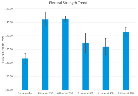 In three-point bending tests the load condition involves bending under a combination of compressive and tensile stresses. The results of the three-point bending tests, illustrated in Figure 20, indicate the ultimate flexural strength of PEEK. When compared to the not-annealed sample with an ultimate flexural strength of 132 ± 1.8 MPa, all the annealed samples have increased in ultimate flexural strength. Therefore, an annealed flexural sample of PEEK had a higher ultimate flexural strength than a not-annealed sample, which was validated by previous studies [49,50,51]. Among the annealed samples, those treated at 330 °C had the highest flexural strength, reaching 146 MPa, while samples annealed at 360 °C showed lower values. Within the 360 °C samples, the longest duration, 6 h, had the highest ultimate flexural strength of 141 ± 3.5 MPa and the second highest was the shortest duration, 3 h, at 137 ± 7 MPa. The lowest ultimate flexural strength among the 360 °C samples and all annealed samples was observed at 4 h of annealing, with a strength of 136 ± 6 MPa. This conclusion for ultimate flexural strength was found in previous studies where the annealed samples exhibited a higher flexural strength when compared to a not-annealed sample [51].