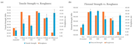 Figure 21 compares the microscale characteristic of roughness to the macroscale mechanical analysis of tensile strength and ultimate flexural strength. The roughness of the surface topography starts lower with the not-annealed sample at 12.3 nm and then jumps to 37.7 nm when annealed for 3 h at 330 °C. The sample annealed for 6 h at 330 °C had a surface roughness of 32.2 nm and the sample annealed for 3 h at 360 °C had a surface roughness of 38.5 nm. These roughness values are relatively high and are due to the sample in the melting and recrystallization process. At a longer duration of 4 h at 360 °C, the roughness starts to drop as the recrystallization process progresses to 27.5 nm. Once the sample is annealed at the highest temperature, 360 °C, and longest duration, 6 h, the surface roughness drops to 5.21 nm, which means the polymer chains have relaxed. In Figure 21a, the surface roughness directly correlates to the tensile strength of annealed samples because the high-roughness samples have a lower tensile strength while the lower-roughness samples have a higher tensile strength. The not-annealed sample has a roughness of 12.3 nm and a tensile strength of 83.9 MPa while the sample annealed for 6 h at 360 °C has a roughness of 5.21 nm and a tensile strength of 90.0 MPa. Therefore, the surface roughness dropped by 7.06 nm, and the tensile strength increased by 6.1 MPa. In Figure 21b, the 330 °C samples have the highest flexural strength but also have the highest roughness value. When the roughness drops in the samples annealed for longer durations at 360 °C the flexural strength is still higher than the not-annealed sample but not as high as the samples annealed at 330 °C.