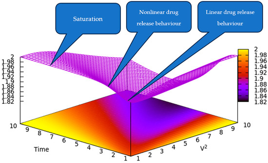 A 3D representation of the drug release rate is indicated by the color gradient as a function of time and V2 according to Equation (32). V2 and time are reduced coordinates.