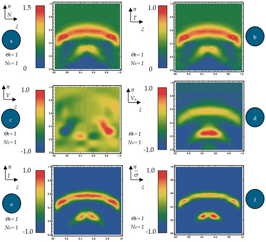 Equation (61), with the initial conditions (62) and the boundary ones (63), were numerically integrated via finite differences [32]. By means of numerical solutions, in Figure 4a–f, the dependences of the normalized states density , normalized internal energy per unit volume (b), normalized velocity (c), normalized velocity (d), normalized current density , (e) and diagonal component of the normalized internal stress tensor type (f) on the normalized spatial coordinates at the normalized times = 0.65 for and are plotted. For the same dependences, the contour curves are plotted in Figure 5a–f.