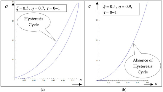 (a,b) The dependence of the diagonal component of the normalized multifractal stress tensor , on the normalized internal energy, for ξ = 0.5, η = 0.7, τ = 0–1 (hysteresis cycle (a)) and for ξ = 0.5, η = 0.9, τ = 0–1 (absence of hysteresis cycle (b)).