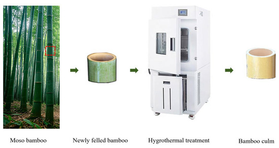 The newly felled bamboo had an initial moisture content of approximately 75%. After removing the nodes, the bamboo was processed into culms with a height of 3 cm. Subsequently, the round bamboo was hygrothermally treated in a high- and low-temperature humidity test chamber (BPHS-060A, Shanghai Yiheng Scientific Instrument Co., Ltd., Shanghai, China) under different conditions (Figure 1). Finally, the round bamboo was conditioned in the chamber at 65 ± 5% of relative humidity and a temperature of 20 ± 2 °C until reaching an equilibrium moisture content.