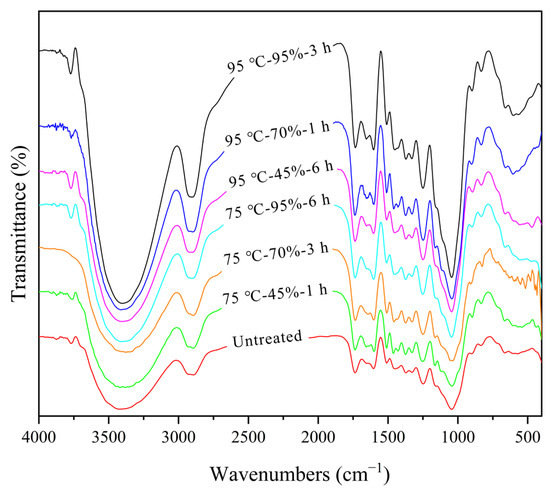 The peaks at 1510 cm−1 and 1600 cm−1 were ascribed to the C=C stretching of the aromatic skeletal vibrations in lignin [31,32]. The glass transition temperature of lignin decreases with the aggregation of water molecules in molecular chains [21,22,23,33], which decreases from 160 °C to 60–95 °C as dry wood turns into moist wood [24]. Straw or bamboo lignin is classified as a G-S-H lignin, and the glass transition temperature of wheat straw lignin is about 53–63 °C with a water content of 8.4% [25]. Therefore, the molecules of lignin in newly felled bamboo stems obtained sufficient energy to undergo glass transition under hygrothermal treatment at a temperature of 75–95 °C and a relative humidity of 70–95%. In the highly elastic state, lignin molecular chains may rearrange, increasing the intensity of C=C stretching in the aromatic skeletal vibrations. Overall, the chemical structure of the bamboo hardly degraded, but its molecular chain had been rearranged.