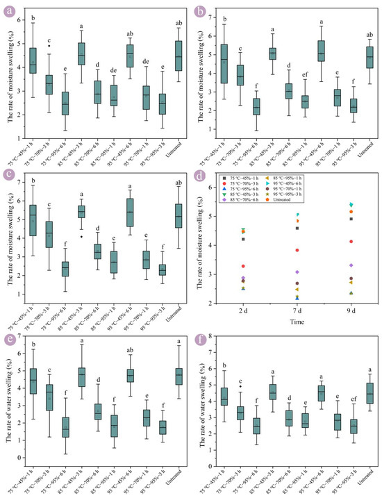 The wall swelling rate of round bamboo in a radial direction after hygrothermal treatment. (a) The rate of moisture swelling for 2 d, (b) 7 d, and (c) 9 d. (d) The scatter plot of moisture swelling. (e) The rate of water swelling for 7 d, (f) 60 d. Note: The swelling rates followed by the same superscript letters in the same figure are not significantly different.