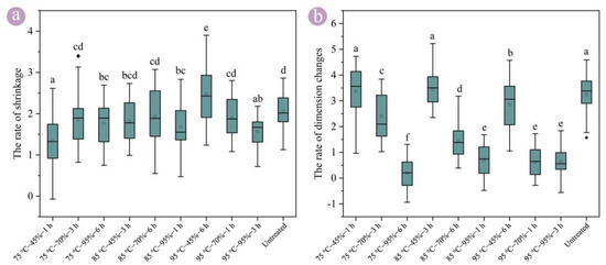 The wall shrinkage rate of round bamboo in a radial direction after hygrothermal treatment. (a) Water loss for 7 d compared to the water-saturated state; (b) water loss for 7 d compared to the initial equilibrium state. Note: The shrinkage rates followed by the same superscript letters in the same figure are not significantly different at <0.05.