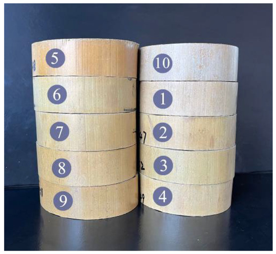The visual appearance of the round bamboo samples was evaluated by surface color using a chroma meter (CC-6834, BYK-Gardner, Grazrid, Germany), referring to the color space CIE L*a*b*. CIE L*a*b* is defined by the International Commission on Illumination, the L* (lightness), a* (red–green coordinates), b* (yellow–blue coordinates), and C* (color saturation) were measured using a D65 illuminant and a 10° standard observer. The color changes in the round bamboo samples were calculated in terms of the difference before and after hygrothermal treatment. For example, Δa = a*after − a*before. To reduce experimental errors, the measurement was performed 20 times. The images of the round bamboo samples were captured on a mobile phone (iPhone 13, Apple, Cupertino, CA, USA).
