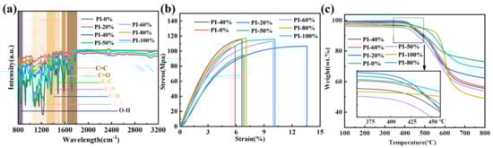 (a) FTIR, (b) strain–stress curve, and (c) TGA of PI films in different copolymerization systems.