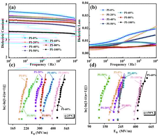 (a) The dielectric constant, (b) dielectric loss, and Weibull breakdown strength of polyimide films with different copolymer ratios at (c) 25 °C and (d) 150 °C.