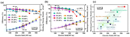 The discharge energy density and charge–discharge efficiency of PI films with different copolymer ratios at (a) 25 °C and (b) 150 °C. (c) Comparison of discharged energy density for pure polymers at 25 °C.