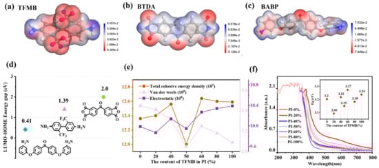 (a–c) The electrostatic potential distribution of three monomers according to DFT calculations. (d) The energy gap difference between HOMO and LUMO for three monomers was calculated. (e) The cohesive energy, van der Waals forces, and electrostatics were studied by DFT calculations. (f) UV-Vis-NIR diffuse reflectance map of PI films with different copolymerization ratios: the small graph in the upper right corner shows the absorption wavelength of different polymer ratios and the optical bandgap (Eg) calculated using Planck’s Law.