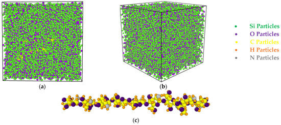 The preceding sections examined the role of TCP as a reinforcing agent in chitosan–silica aerogel NCs, which led to an increase in the strength and hardness of these materials. The effects of varying atomic percentages of TCP (2, 3, and 5%) in chitosan–silica aerogel NCs were examined in this study using MD simulations and LAMMPS (30 July 2021 version) software. The coordinates of atoms and their connections were included in the initial configuration. The simulation box dimensions for this investigation were established at 110 Å. The initial step entailed the modeling of silica aerogel using Avogadro software []. The NVT ensemble was employed to generate a sample at 7000 K for 1 ns in order to replicate the silica aerogel. The NVT ensemble was employed to gradually decrease T to 300 K over a period of 1 ns in the second stage. The structure with the NPT ensemble was minimized by adjusting T and pressure to 300 K and 1 bar for 1 ns in the third phase. The NVT ensemble was then employed to increase T to 3000 K over a 1 ns period. Ultimately, T decreased from 3000 K to 0 K. The chitosan and TCP nanostructures were subsequently extended in the simulation box using Packmol (V.20.16.0) software and Avogadro (V.1.95) software []. Figure 1 illustrates the atomic structure of chitosan/silica aerogel/TCP from various angles. The equilibrium of the structure was determined by the NVT ensemble after the initial modeling. A Nose–Hover thermostat was employed to equilibrate the necessary structure at an initial T of 300 K. This study investigated physical variables, including potential energy (PE). Subsequently, the ensemble transitioned to NVT, and the mechanical properties of the structure were examined.
