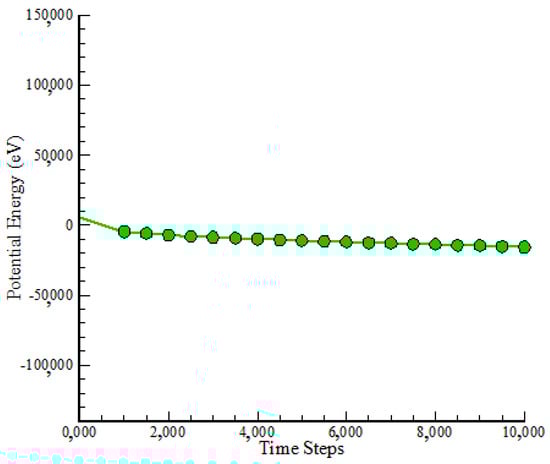 Figure 3 depicts the variations in PE of the modeled NC over time. It is envisaged that these adjustments would coincide with general T fluctuations. After 10,000 time steps, the numerical value of PE had reached −15,651.15 eV. The convergence of PE with time revealed a reduction in mobility inside the atomic samples. Reducing atom mobility inside the simulation box resulted in fewer oscillations and a more physically stable structure. This equilibrium was approximated by taking into account the attractive forces between distinct components of atomic structure. The proportionality between the specified atomic structure and selected force field was critical in reaching this equilibrium, demonstrating the acceptable approach adopted in this study.
