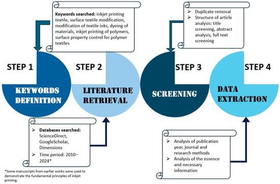 A systematic literature review procedure was used for this article to examine scientific publications on methods to improve the quality of inkjet printing on textile materials. The search was conducted using ScienceDirect, Google Scholar, and Dimensions. It consisted of searching doe these keywords to find the literature in article titles, abstracts, and keywords. Only English articles in peer-reviewed journals published from 2010 to 2024 were included, although some older and more recent publications were also added to explain the fundamentals of some processes, such as the principles of inkjet printing. Figure 3 shows the detailed process of reviewing this literature.