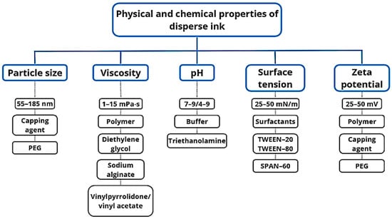 Figure 4 displays the primary physicochemical properties of dispersed inks that impact textile printing quality. Viscosity is a crucial factor in achieving favorable inkjet printing outcomes as it affects filament stretching (droplets/droplet satellites) and fluid behavior during the process. Surfactants decrease ink surface tension and guarantee consistent drop ejection from the inkjet printer head nozzle. To optimize the formulation, it is important to pay close attention to the nature and amount of chemicals due to the binding affinity between surfactants and colorants. Consider the structure of surfactants and dyes, critical micelle formation concentration, maximum additive concentration, and other relevant parameters [,].