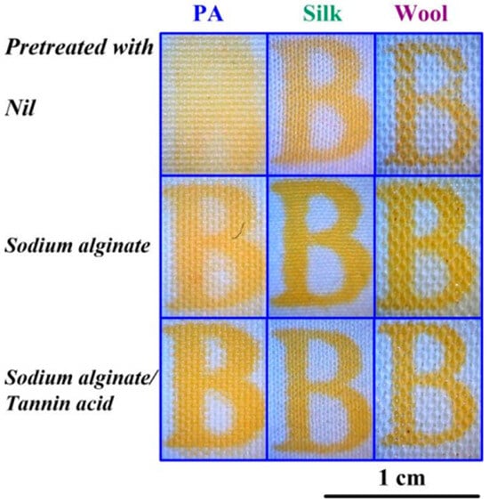 - An, F.; Fang, K.; Liu, X.; Yang, H.; Qu, G. Protease and sodium alginate combined treatment of wool fabric for enhancing inkjet printing performance of reactive dyes. Int. J. Biol. Macromol. 2020, 146, 959–964. [Google Scholar] [CrossRef]