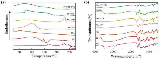 Thermal behavior analysis and Fourier Transform Infrared Spectroscopy (FT-IR) for composite systems of PF/PVA/PTA: (a) DSC; (b) FT-IR.