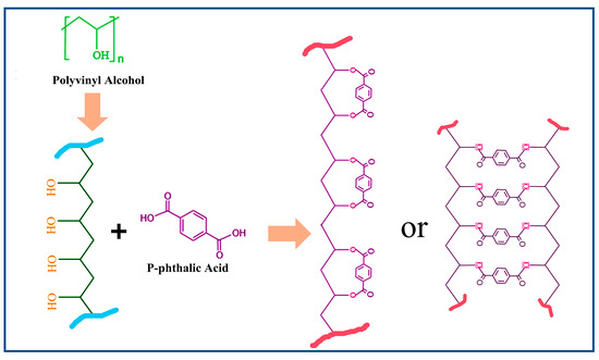 The esterification reaction proceeds via an acid-catalyzed mechanism, where reaction kinetics are governed by temperature-dependent proton mobility and molecular chain dynamics. At lower temperatures, limited proton transfer and restricted chain mobility result in suboptimal reaction rates. Elevated temperatures enhance both proton migration (via thermal activation) and the segmental motion of polymer chains, synergistically accelerating the esterification efficiency. In ternary PVA/PF/PTA systems, phenolic hydroxyl groups (-OH) from PF act as acid donors, protonating the PTA carboxylic acid groups (-COOH → -COO−H+). This protonation markedly increases the electrophilicity of the PTA carbonyl carbon, facilitating a nucleophilic attack by PVA hydroxyl groups (-OH) to form ester linkages (-COO-). Concurrently, PF participates in constructing a hydrogen-bonded network with PVA and PTA, reducing the reaction activation energy through transition-state stabilization [36].