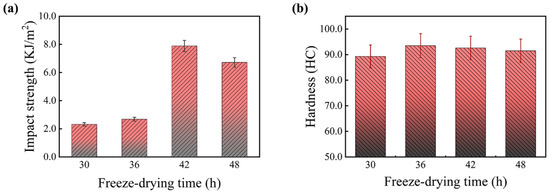 Effect of freeze-drying time on the mechanical properties of PF/PVA/PTA composites. (a) Impact strength; (b) Hardness.