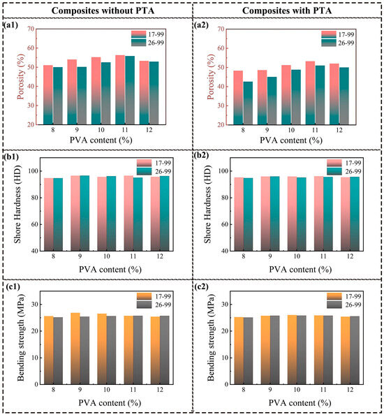 Comprehensive mechanical properties of PF/PVA/PTA/SiC composites: (a1,a2) Porosity; (b1,b2) Shore hardness; (c1,c2) Bending strength.