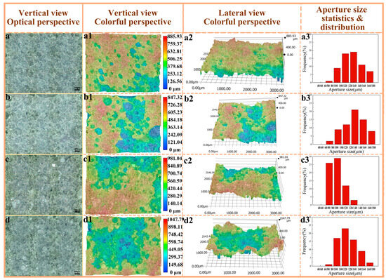 Color depth-of-field photographs of pore structure and statistics of pore size distribution. (a–a3) PF/PVA-1799; (b–b3) PF/PVA-2699; (c–c3) PF/PVA-1799 + PTA; (d–d3) PF/PVA-2699 + PTA.